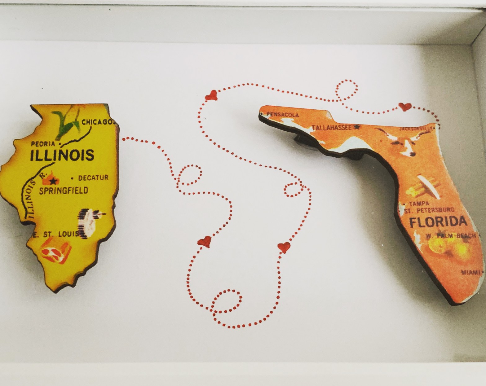 Words of thanks for this special friendship are not enough, so I helped to create this piece of art as a gift specifically designed by me. I chose the two states connecting me – Florida and Illinois – and told the artist the specific cities – Jacksonville and Chicago – and how I want to link those two cities. I chose the white shadowbox wood frame, then the store staff framed this for me, and I gave this to my Jacksonville friend.