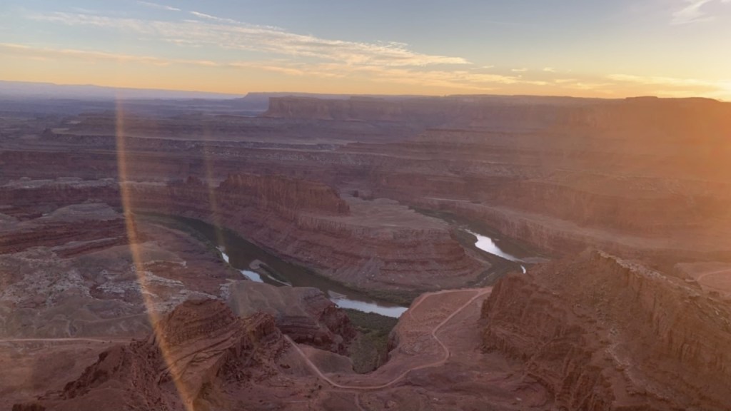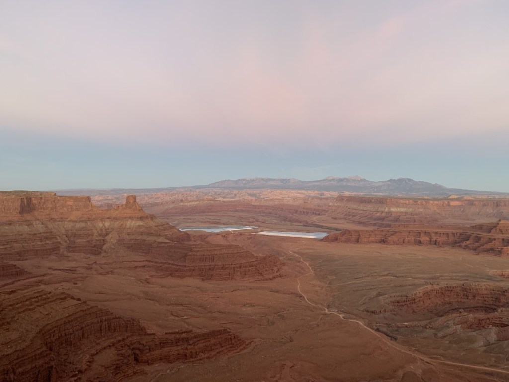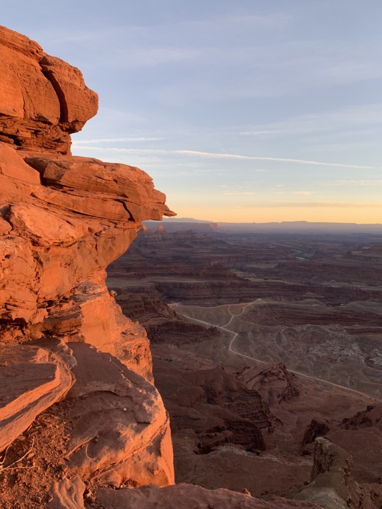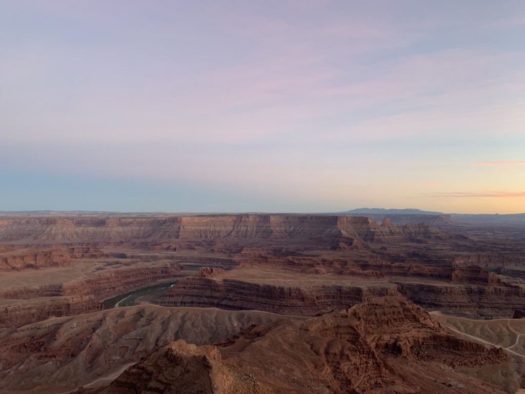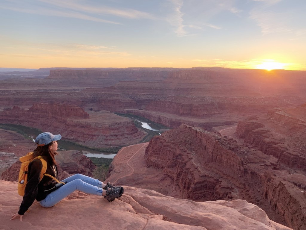 If you visit Moab, you should not miss the most stunning sunset at Dead Horse Point State Park. I drove to the end of park, reaching the dead horse point overlook. I saw different vast layers on the red rock canyon. It looks like a different planet from Earth. I looked down the gorgeous ever-changing landscape to the Colorado River.