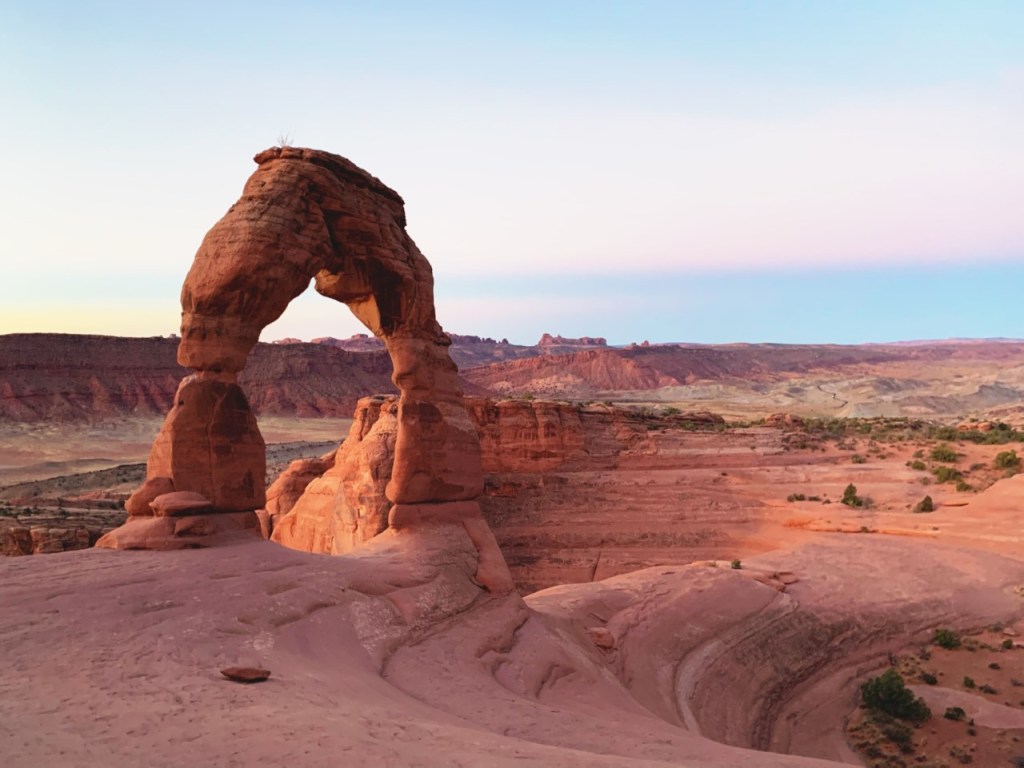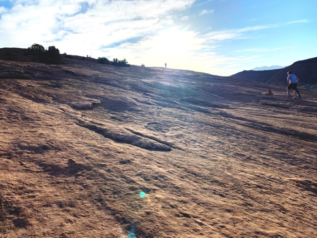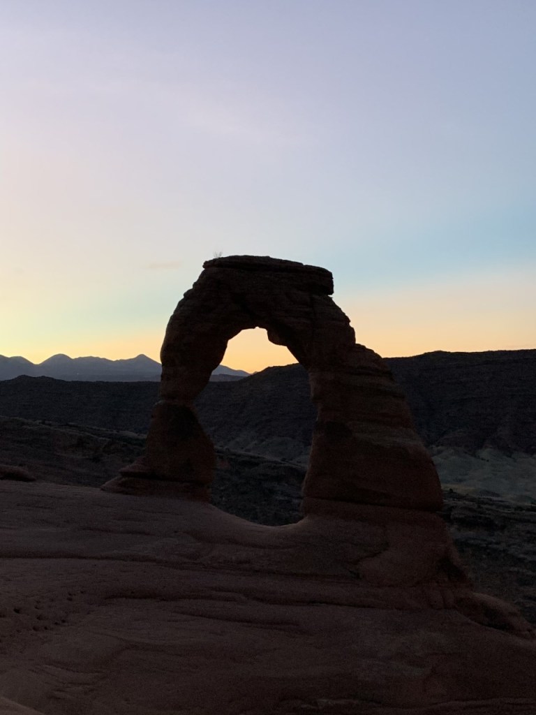 Hiking in the dark is totally different from hiking during the day. It takes time for your eyes to adjust to the dark, and my flashlight helped. I met an elderly couple hiking along the way, and we hiked to the delicate arch together. In the dark, we got lost a few times, as there were no trail markers. We stopped and observed our surroundings, then saw a few lights far away, realizing we should head in that direction, and followed the light hike back to the correct trail. Because it was early, and a lot of the path was uneven, steep and uphill, I had to breath heavily. We hiked approximately 45 minutes to reach the arch.