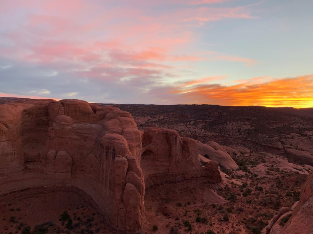 I wanted to witness the most stunning sunrise/sunset, and to do so I needed to hike in the dark. On October 19, I woke up at 4:00 a.m., then drove in the dark, alone, through Arches National Park. At the beginning, I felt uncomfortable and nervous because it was my first time driving up the curved mountain roads, in the dark, so I drove carefully, then adjusted to it. My eyes kept searching the road signs in the dark, but I missed the turn to take me where I originally planned to see the sunrise, so I kept driving to the delicate arch viewpoint parking lot. An adventurer must be able to improvise!