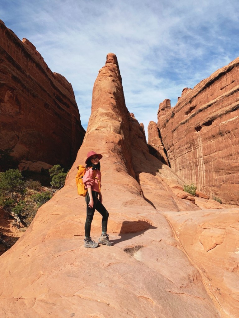 I was very impressed during this dark journey: when I looked up, stars studded the sky. Then I witnessed the sky change color, turning from black to orange with the dawn. The sunlight shone on the arch at different angles, creating a spectacular sunrise to welcome a beautiful new day and adventure in the park. Hiking in the dark and seeing this amazing sunrise was a wonderful way to connect myself to nature.
