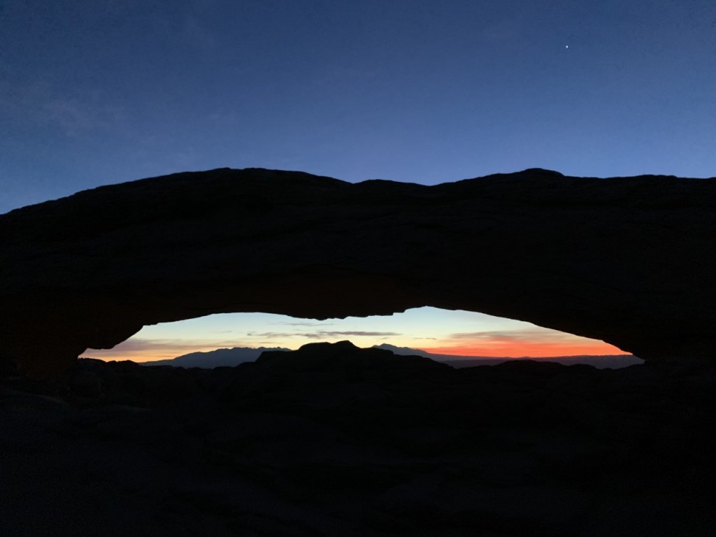 Mesa Arch, Canyonland is one of the most famous sunrise spots in Moab. On October 20, I woke up at 4:00 a.m. again, then drove 40 minutes, entirely in the dark, without passing a single other car on the way to canyonland. I hiked in the dark again, but compared to the delicate arch, this was an easy trail, just an eight minute hike. I arrived around 6:30 a.m., the sky was still dark, but a few photographers were there waiting.