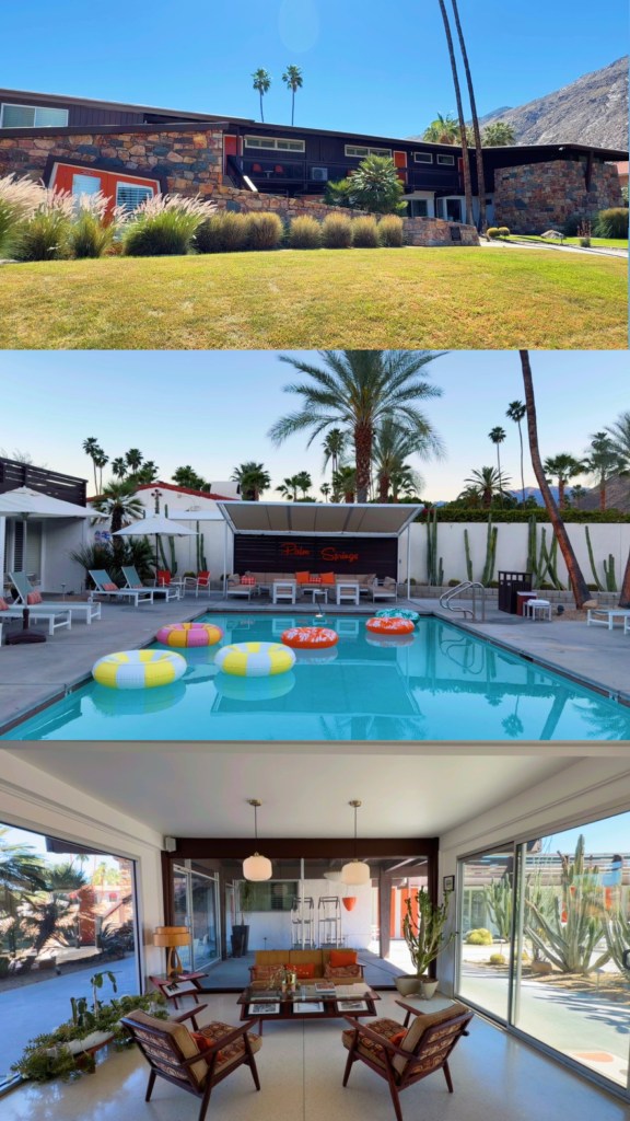 The iconic Kaufmann House, designed by Richard Neutra in 1946, has been described as “an architectural marvel that helped define Palm Springs’ modernist aesthetic.” Even from the outside, under the scorching sun, I admired the cacti, palm trees, and rocks, noting the juxtaposition between the structure and its natural surroundings, as well as between horizontal and vertical lines.