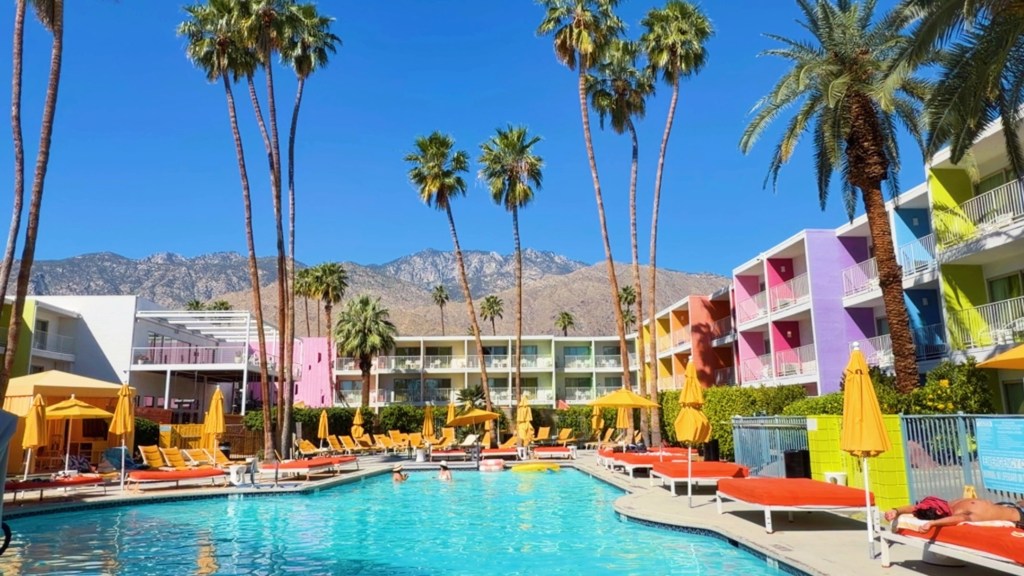 I stood under the roof of the Royal Sun Palm Springs, savoring the delicate balance of shade and light. Each detail seemed to speak to me, its precise symmetries and atmospheric color palette, from retro orange to sage green, captured both the essence of both the surrounding desert and the historical inspirations behind the hotel’s design.