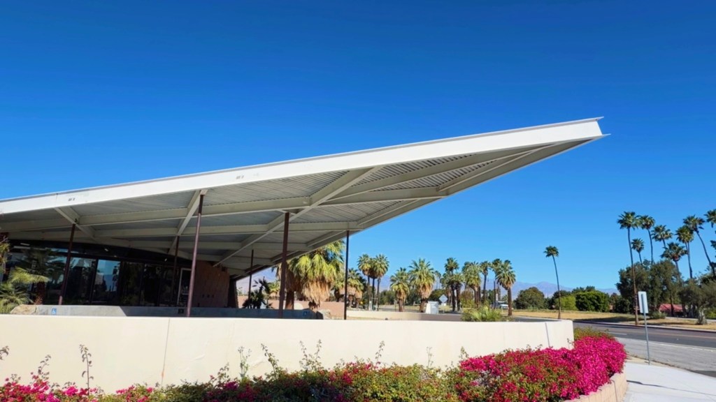 I ran for shelter beneath the white roof of the Palm Springs Visitor Center, constructed from corrugated galvanized steel and supported by six steel pipe columns. Its soaring, V-Sloped profile creates a striking modernist silhouette.
