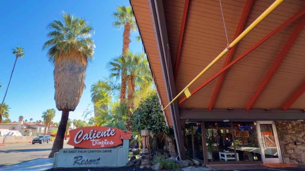 The iconic A-frame, steeply pitched roof at the Caliente Tropics Resort like a Polynesian beacon against the desert sun, inviting me to its playful, tropical world. Tiki carvings, some original figures by Ed Chrisman, lined the roofline, complemented by lush landscaping that evokes the hotel’s 1960s vibe, offering a refreshing respite from the desert heat.