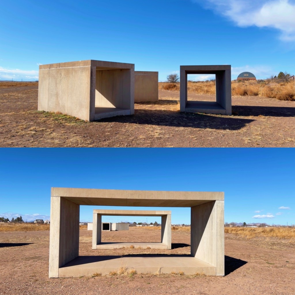 I wandered through this walkable town, where simplicity filled every corner, sun-kissed streets lined with modest galleries and local shops, as I admired Donald Judd’s concrete and aluminum works, Robert Irwin’s Untitled (Dawn to Dusk), and Dan Flavin’s fluorescent light installations, found the balance between the architecture, the desert and the artworks.