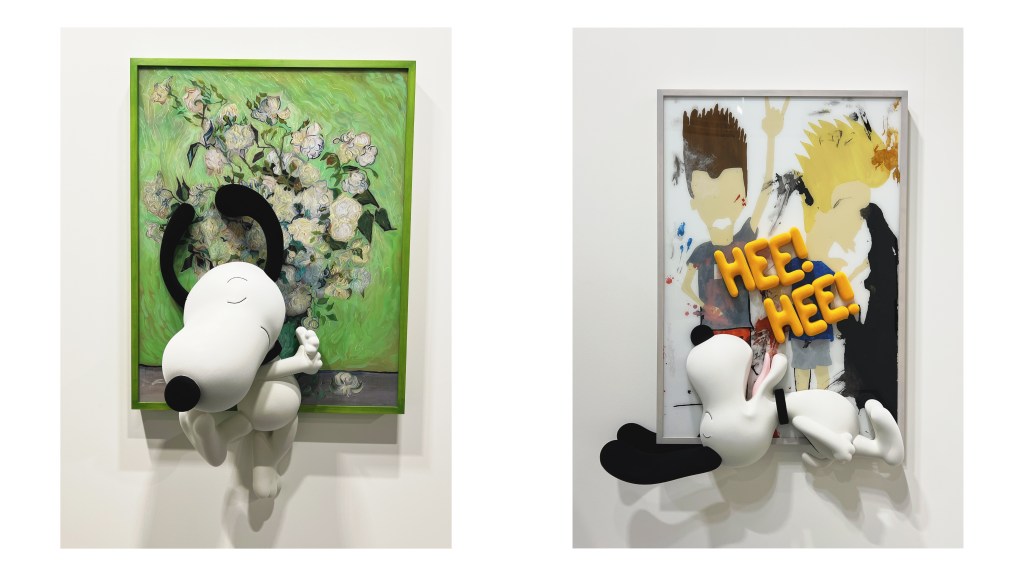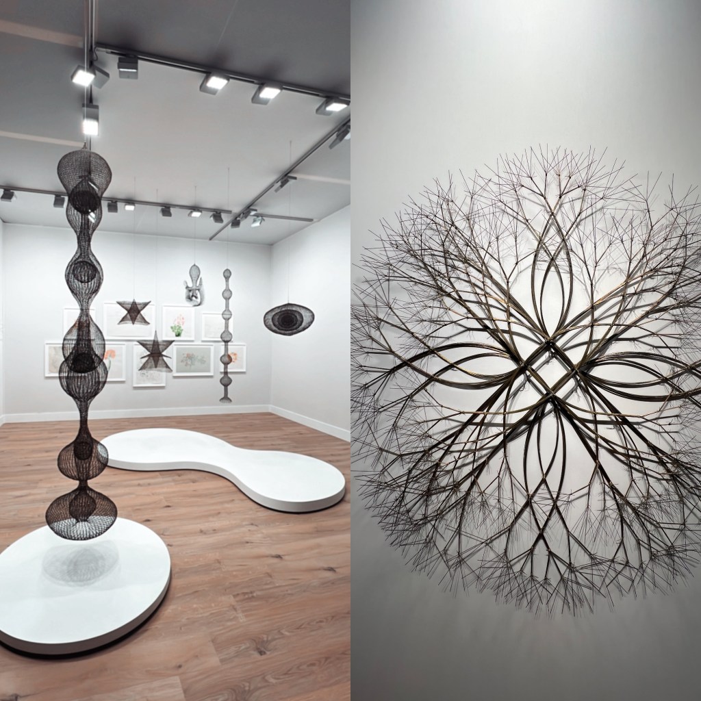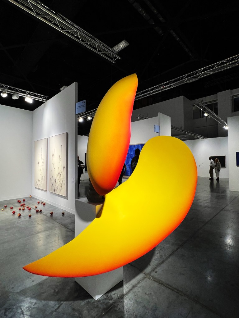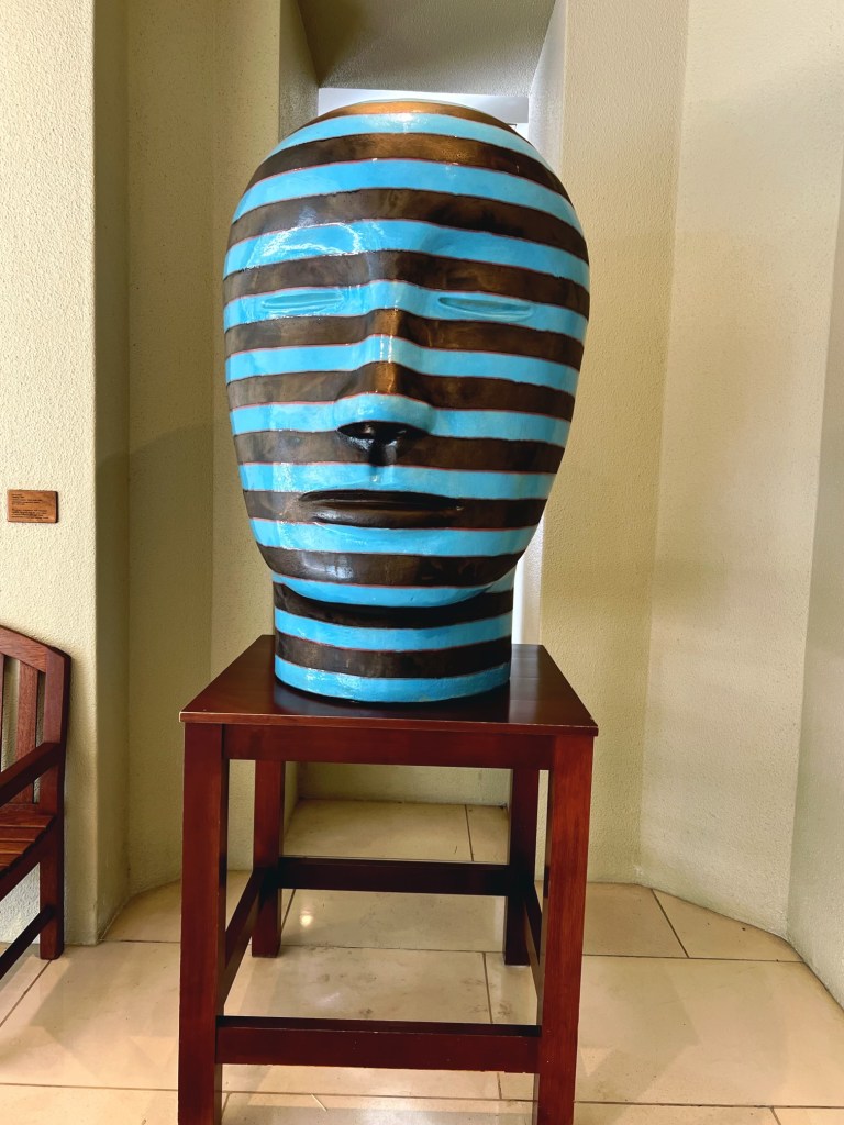 I glimpsed the building’s design: a cantilevered concrete and granite façade rising like an upside-down pyramid, distinctive trapezoidal windows, and a lobby illuminated by countless circular discs, each holding a single silver-tipped bulb, casting a refined and singular glow. I noticed the Breuer lobby gallery, which showcases works from the Collection of Dorothy and Roy Lichtenstein. On one wall hung British Artist Damien Hirst’s Momentary Love Blossom painting, set in contrast to a rainbow-hued concentric square work by Frank Stella that commanded attention, while a Jean Arp sculpture stood nearby, completing the dynamic interplay of form and color.