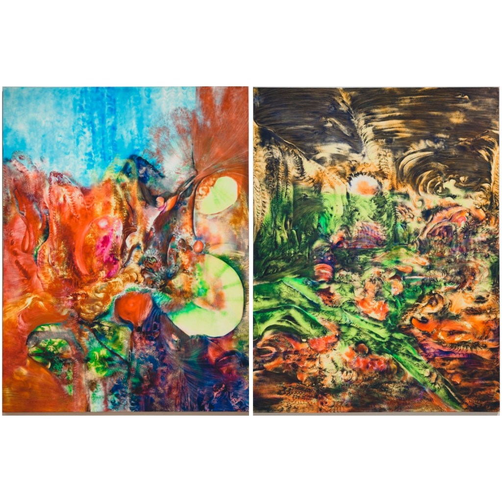 Leonora Carrington’s Sin Titulo caught my eye immediately. It presents two intertwined, headless figures set against a glowing ochre background, merging in a ritualized embrace with their bodies rendered as contrasting yet equal forces. Their black and white bodies, feminine and masculine, transcend individual identity, embodying the mystical union of opposites, while their heads release luminous streams of energy, symbolizing rebirth and transformation.