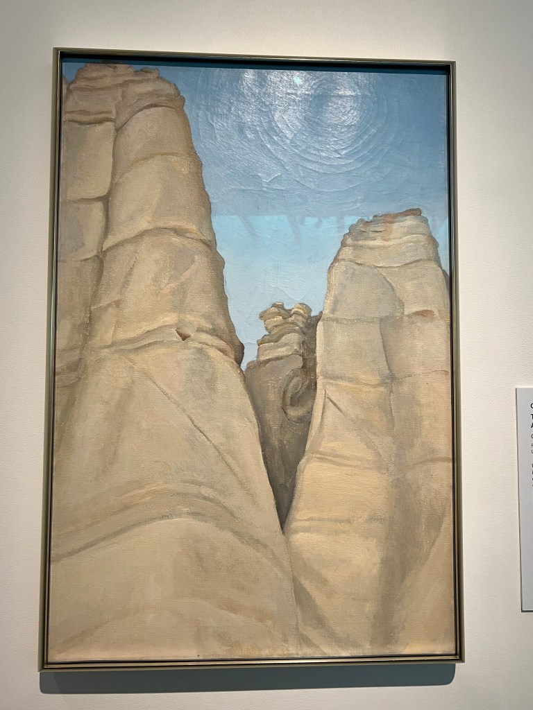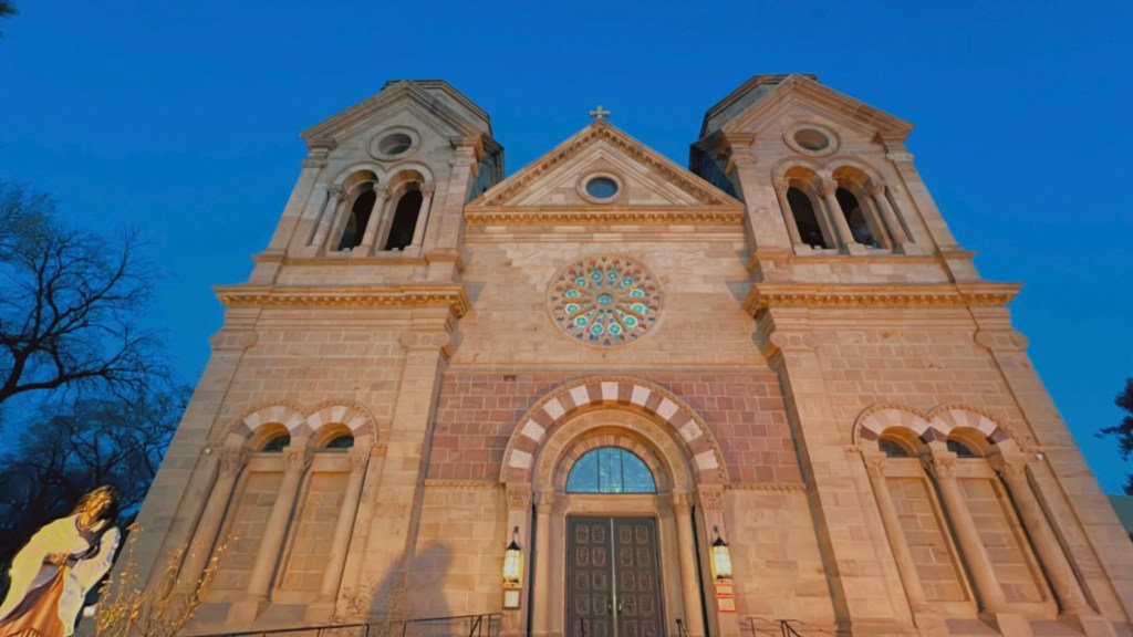 I observed each detail of Cathedral Basilica of St. Francis of Assisi in downtown Santa Fe twice. It was built by Archbishop Jean Baptiste Lamy between 1869 and 1888 on the site of an older adobe church. It was designed in the Romanesque Revival style, influenced by French-born Archbishop, and in contrast to the surrounding adobe structures, features characteristic round arches separated by Corinthian columns and truncated square towers, along with a large rose window in front. The lateral nave windows imported from France featuring the twelve apostles are highly detailed and ornate. Built of yellow limestone bricks, it blends in with the sand and dirt of the surrounding landscape. I also noticed the small dove window and more stunning stained glass are featured throughout the cathedral.