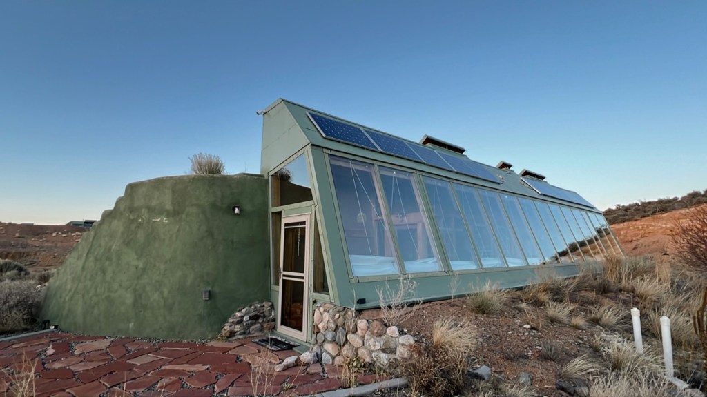 An Earthship, which Lonely Planet describes as “equal parts Gaudi masterpiece and Dr. Seuss whimsy”, offers accommodations that are completely off-grid. Built from recycled materials, the home is powered by solar panels, rain and snow-collecting cisterns and a greenhouse for self-sufficiency. It is a style of architecture developed in the late 20th century to early 21st century by architect Michael Reynolds.