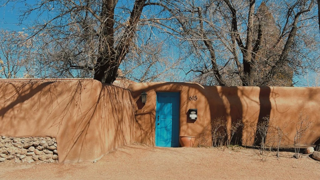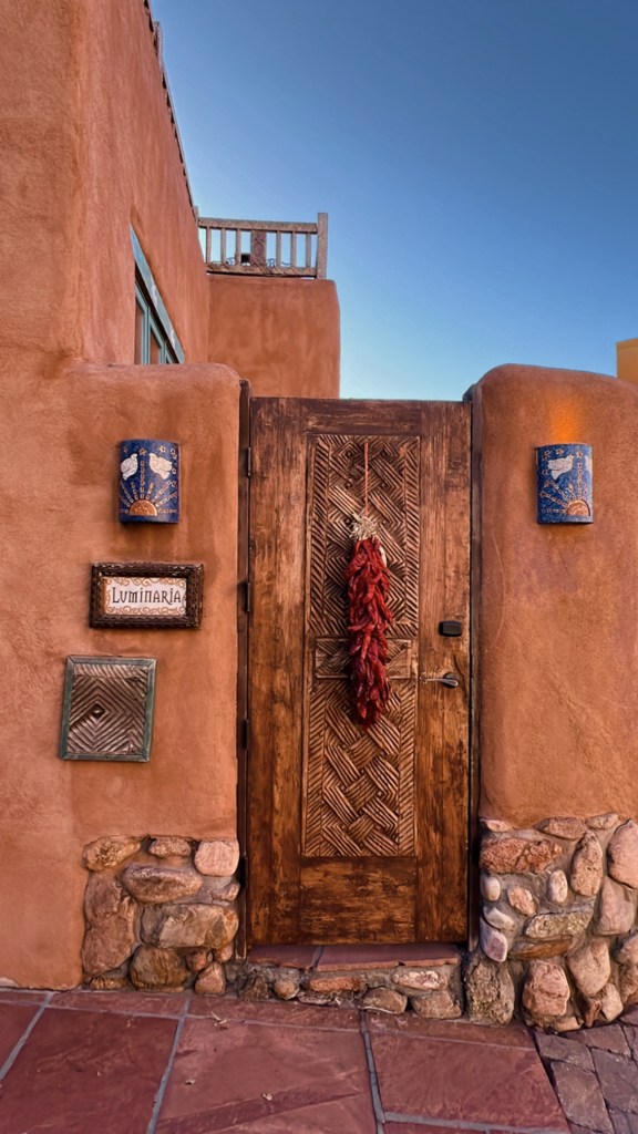 I breathed in the high desert air and took in the fantastic light, with color and brightness around every corner: some unique doors to the fine art galleries, some doors to the spiritual, some wooden doors formed under rounded archways usher me into the gardens, some hanging with ristras, some with a hand-shaped doorknocker.
